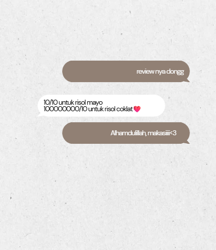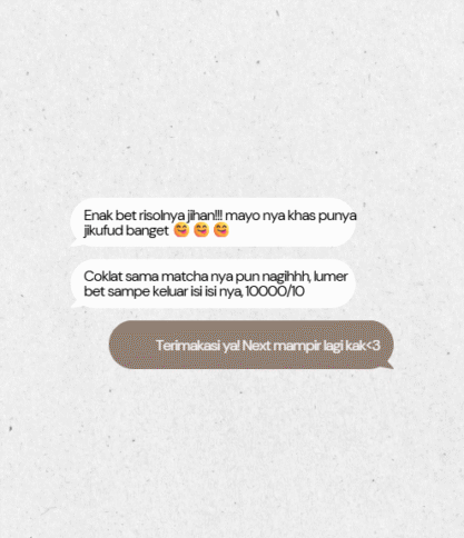 We serve crispy, creamy risoles, super chewy soft cookies, and mochi filled with generous, delicious flavors! all made from carefully selected ingredients and 100% homemade with love.